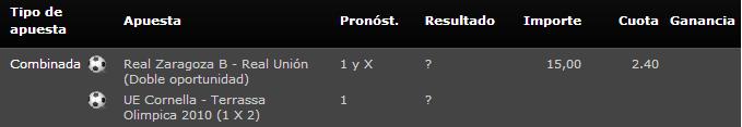 Nuestra siguiente apuesta para este fin de semana será una combinada con la victoria o empate del Zaragoza B y la victoria simple del Cornellà. Los dos partidos tienen un denominador común, y es que los dos equipos por los cuales apostamos deben conseguir los 3 puntos para lograr sus objetivos ante equipos que no se juegan nada.
