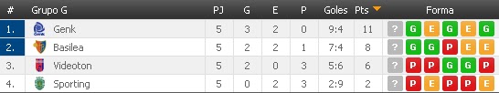 – El Genk belga ocupa la 1ª posición con 11 puntos, a 3 puntos del 2º clasificado, el Basilea. Es decir, le vale empatar para ser primero de grupo.