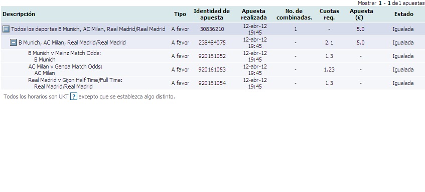 Por lo tanto, combinaremos las victorias simples de Bayern y Milan con la victoria del Real Madrid al descanso y al final del partido, que nos da una cuota resultante por encima de 2. Apostaremos 5€ para La Liga de los Blogs y 5€ más en nuestra cuenta, para hacer un total de 10.